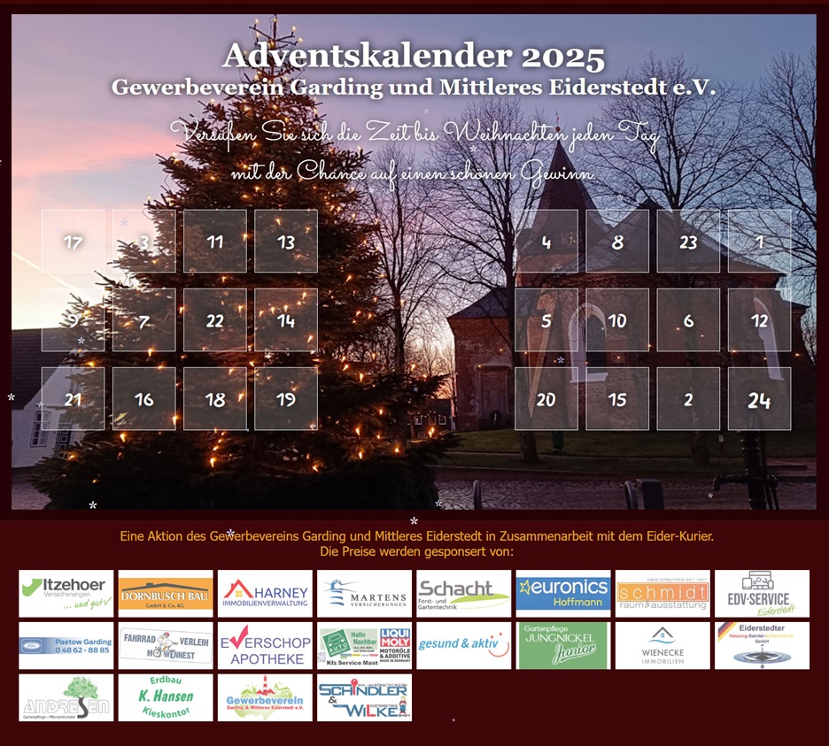 Der Gewerbeverein Garding & Mittleres Eiderstedt e.V. veranstaltet in diesem Jahr einen digitalen Adventskalender, bei dem Sie täglich mitmachen und wunderbare Preise gewinnen können.